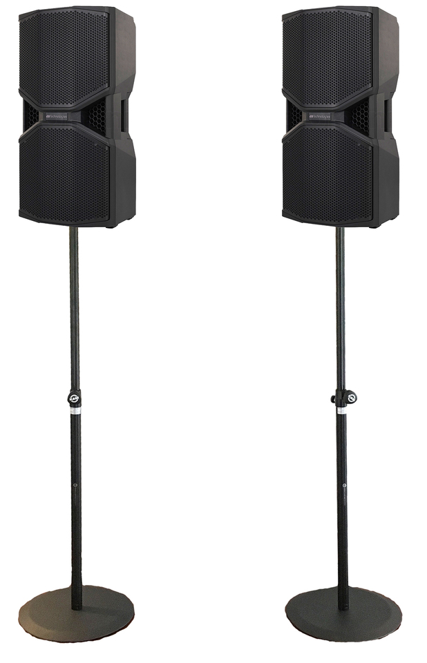 Two dBTech 600watt RMS, 12" speakers on stands.Includes a mixer and two aux cables for music, phone or laptop.