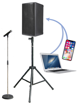 One cabled mic plugs directly into a small 300watt 8" speaker.With an Aux cable to plug in music from a phone or laptop.